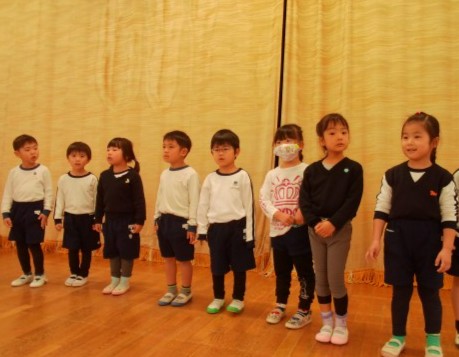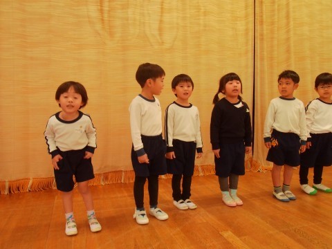 今日は遊戯室で歌と並びかたを練習をしました。「遊戯室だからいつもの歌声だとお家の人に聞こえるかな?」と伝えると、保育室で歌う時よりも元気に歌っていました。まだ歌詞がわからないところは声が小さくなってしまいがちだけど、明日も練習して少しずつ自信をもって歌えたらいいな♪