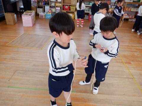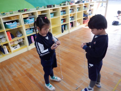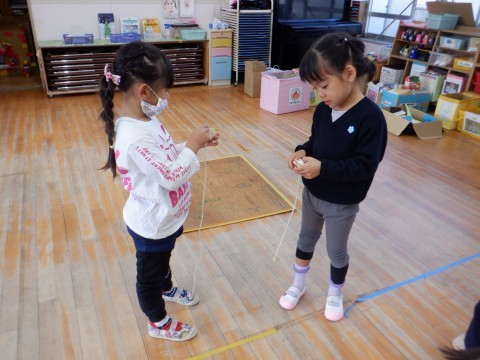 歌の練習が終わってからは、みんなでコマ遊びをしました。糸回しをみんなで練習すると、コツがわかってきた子がどんどん回せるようになってきました。回してみると色を塗ったコマがきれいに見えるので、さらに綺麗に見えるよう重ねて色を塗る様子も見られました。たんぽぽ組全員がコマを回せるようにこれからもたくさん練習していこうね!