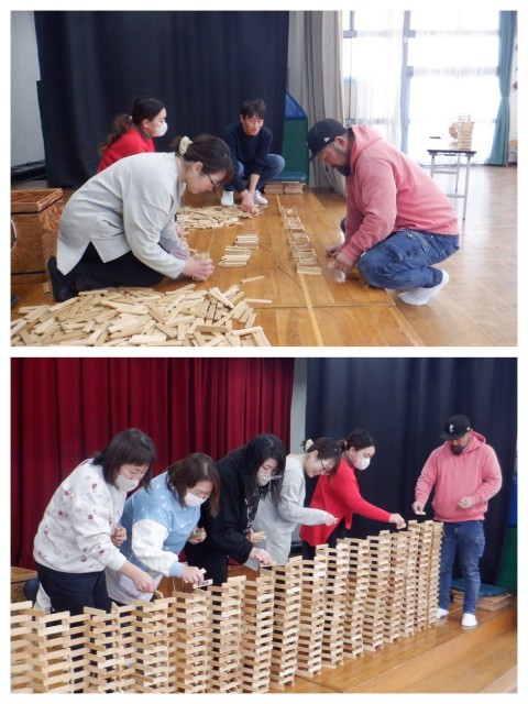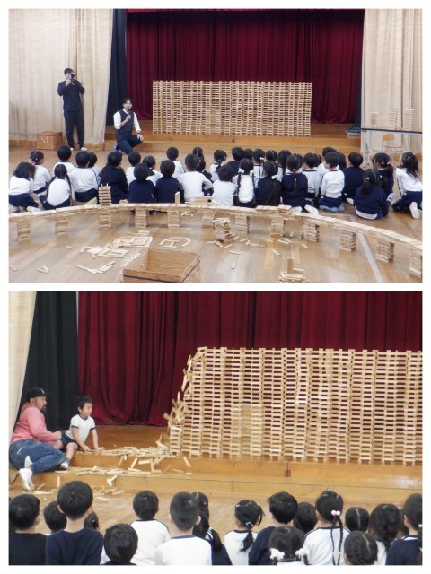 昨年度に引き続き今年度も保護者の方々にお手伝いいただき、ナイアガラの滝をつくってもらいました。舞台の上は歩く度にゆれ「途中で崩してはいけない」という緊張感で手は震えながら、全集中でつくりました。あともう少しで完成!というところできれいに崩れてしまいましたが再び力を合わせて、つくりあげました。