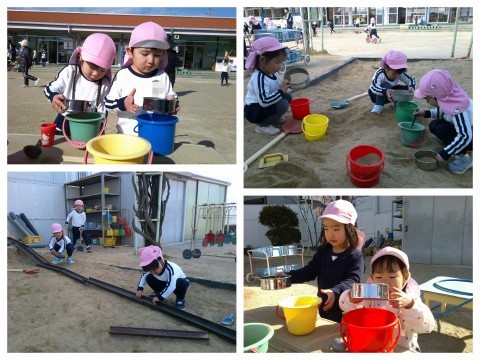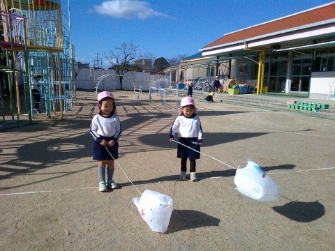 冬らしい風が吹いていますが、子どもたちは戸外で遊ぶことを楽しんでいます。自分でつくった凧を持って元気いっぱい走る子どもたち。今日は、風が吹いた時に凧が風になびくことに気付き、立ち止まって凧の様子を見る姿が・・・。風向きが変わると、「凧が動いた~」と大騒ぎでしたよ。