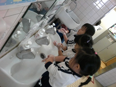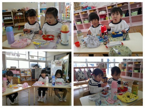 今日から、3学期の午後保育が始まり、朝からお弁当をとても楽しみにしていたもも組さん。手洗いもとても丁寧にしていました。体調を崩すことなく、元気に過ごしてほしいですね。お弁当のふたを開けると、「ハンバーグ入ってる」「わたしも~」「トマト好きやからいっぱい!」などと、とてもうれしそうな声が響き、友達と一緒に楽しくお弁当をいただきました。保護者のみなさま、3学期もお弁当づくりよろしくお願いします。