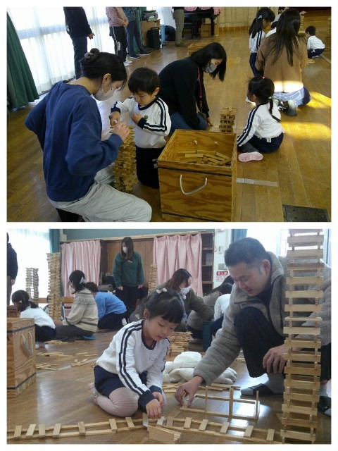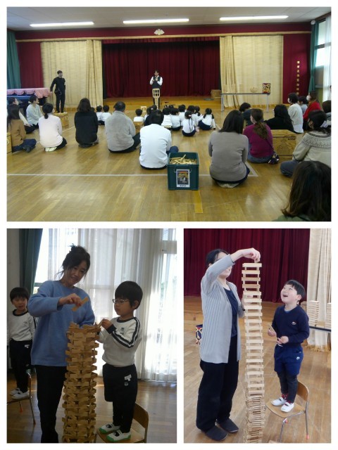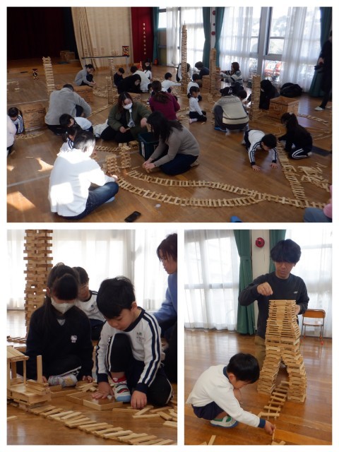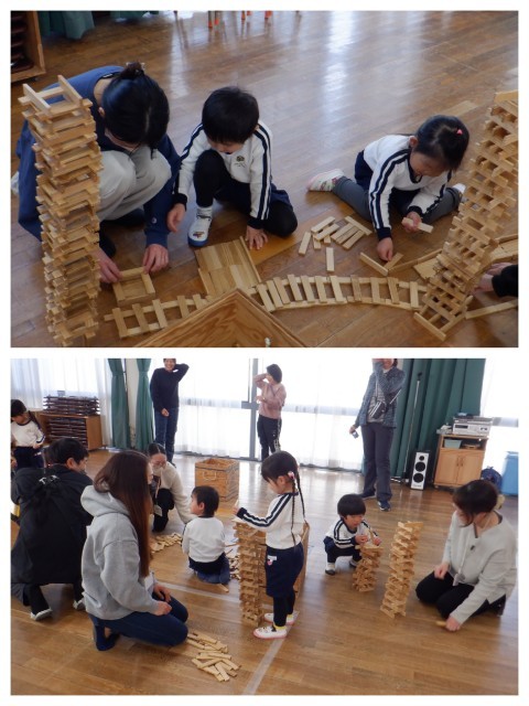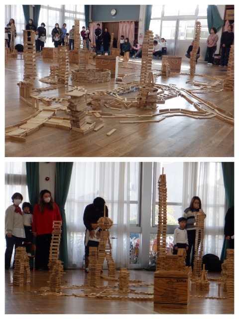 親子カプラワークショップを行いました。最初は誰が一番高くカプラを積むことができるのか高さ競争をしました。子ども達よりもだんだんとお家の人が必死になって積み上げます!カウントダウンが始まると、焦りがでてきてあちらこちらでカプラが崩れますが崩れる音も心地いい♪その後は道や線路で友達がつくったもの同士をつなげて街づくりをしました。4歳児の中には昨年度経験している親子もたくさんいるので、昨年度よりもつくっているものがレベルアップしているように感じました。友達やお家の人と協力して素敵な町ができましたよ。同じ形のものを積み上げたり重ねたりつなげたりするだけで、色々な形にかわっていくカプラを親子で存分に楽しみました。また保育室でも友達と一緒にカプラで遊ぼうね♪