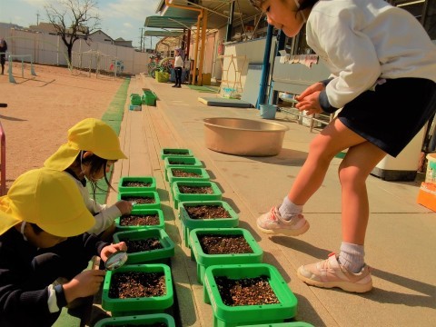 自発活動の様子では、育ってきたクロッカスの芽を虫メガネで覗いたり、お友達と羽根つきをやってみたりといつもと少し違った遊び方をして楽しみました。