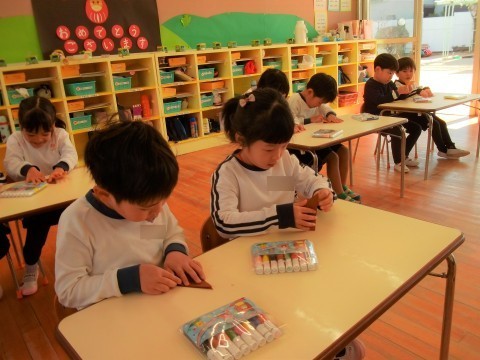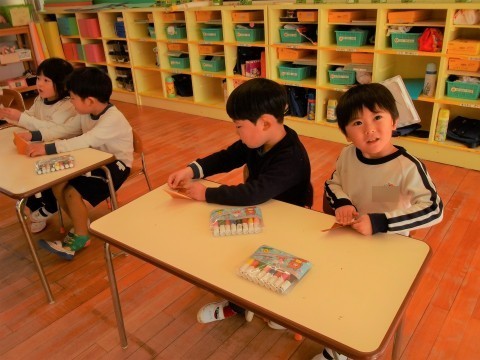 今年は午年(うまどし)なので折り紙でウマを作りました。「馬に髪の毛あるで」「鼻はもっと下だよ」と馬の特徴をよく知っており、手でアイロンをかける姿が増えてきました。馬の色や、髪型の色、表情がそれぞれ違っており、個性のある馬ができて楽しそうでした!一度作った折り方を思い出して、2つ目をチャレンジして折っていました。折り方が分からないときは、友達にも教えてもらいながら作っており、「できた!」がたくさん聞こえたたんぽぽ組でした。