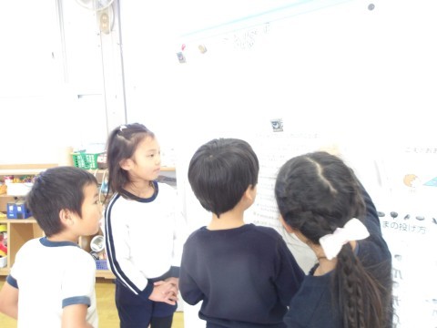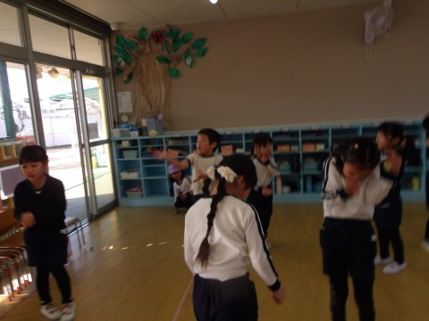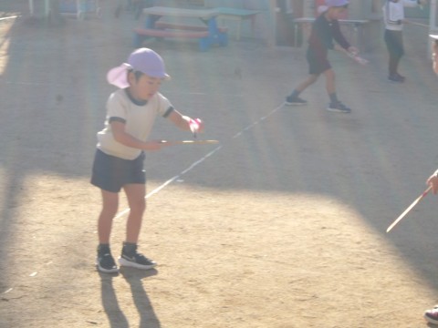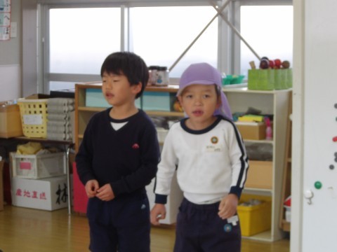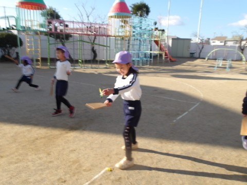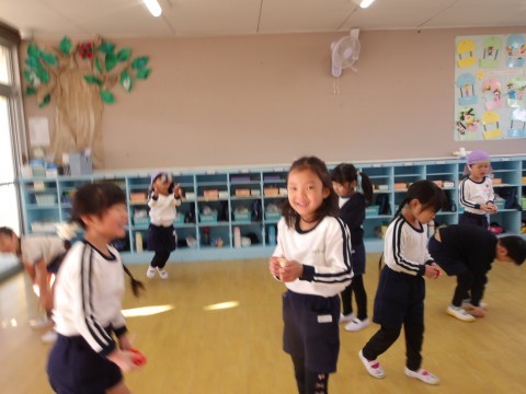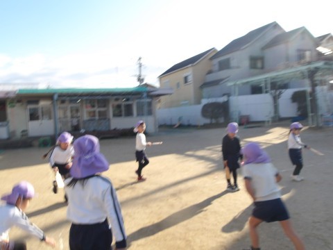 今日はお正月遊びの羽子板をしたり,お手玉をしたり,かるた遊びをしたりしました。羽子板はあいにく風が邪魔をしてなかなか思うようにいきませんでした。お手玉は軽く投げて片手でキャッチにチャレンジしました。キャッチできそうでキャッチできず苦戦しながらもキャッキャと楽しんでいました。少しできるようになると,右から左に投げてキャッチしてみたり,お手玉二つにチャレンジしたりしました。お手玉二つはさすがに難しかったですが,片手キャッチ○回できた!と嬉しそうにしていました。カルタ遊びは自分の名前の字は取りたい!と張り切っていました。明日はお誕生日会です。明日を最後にたんぽぽ組さんにバトンタッチです。最後の司会進行係,頑張ろうね。