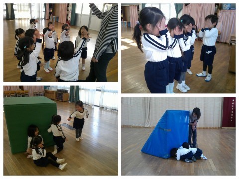 今日も遊戯室でごっこ遊びを楽しみました。先週末に読んだ絵本をよく覚えていて、「みんなでかくれんぼしよう♪」という声が聞こえてきて、他の子どもたちも「やった~!かくれたい!」「さがしにいきたい!」と自分のしたい役をつぶやいていました。最初は、やってみたい役をやってみましたが、「じゃんけんで おにを きめたらいいやん」という話になり、みんなでじゃんけんで鬼を決めてみました。「1・2・3・4・・・」と目を覆って数を数えている姿もかわいかったですよ。隠れたり見つけたりすることも楽しみました♪