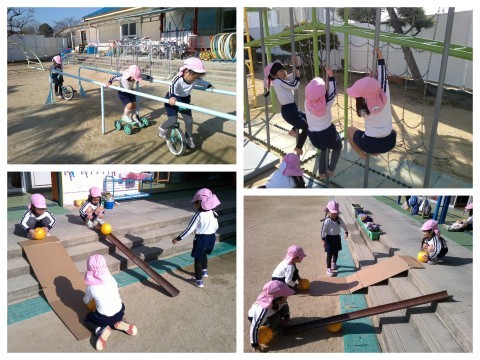 戸外はぽかぽか陽気だったので、1時間近くのんびりと遊びました。一輪車や登り棒へのチャレンジも続いています。運動会ですみれ組さんがチャレンジしていたことに憧れているんでしょうね。未来のすみれ組さん、頑張ってね!!