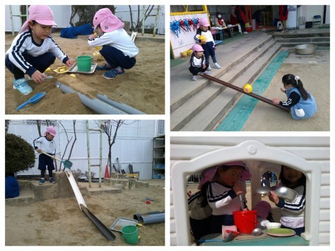 今日は、急に寒くなりましたが子どもたちは元気に戸外で遊んでいました。昨日の遊びの続きをしたり、ひよこ組・こりす組に来ていた未就園児のお友達も一緒に遊んだりしていましたよ。
