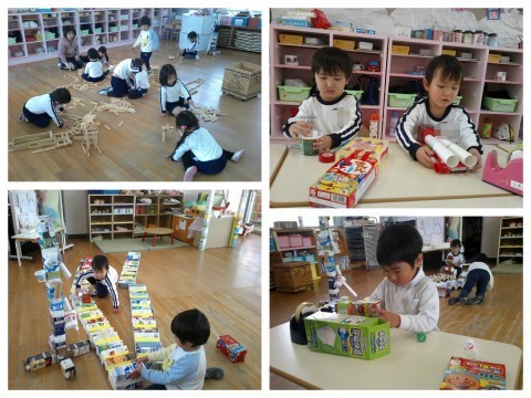 保育室では、箱を使って消防車を工夫してつくっていました。道や建物をつくって、車を走らせたり、火事になって消防車が出動したりとごっこ遊びを楽しんでいましたよ。