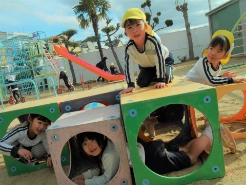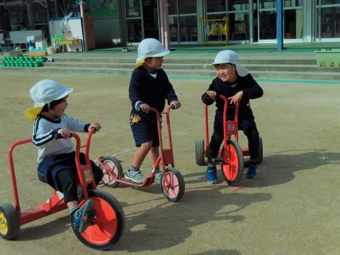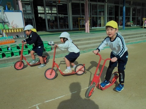 自発活動の様子では、鬼ごっこやボール遊び、ブロックをつなげてバランスゲームを楽しむ姿がありました。お昼の自発でも三輪車やスケーターで楽しみ、遊びたいお友達に譲るやさしいところもありました。