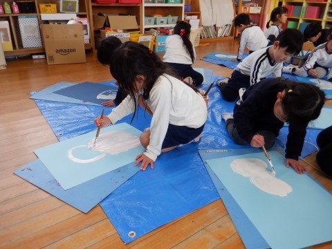 また、ゆきだるまを絵の具で描いてみると、画用紙いっぱいに大きなゆきだるまを描いているお友達や、ゆきだるまをたくさん描いているお友達もいました!お顔はクレパスで描きますので、どんなゆきだるまができるのか楽しみです!