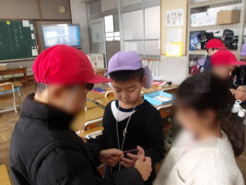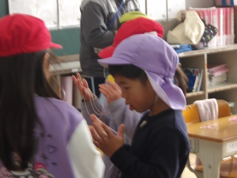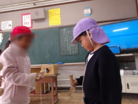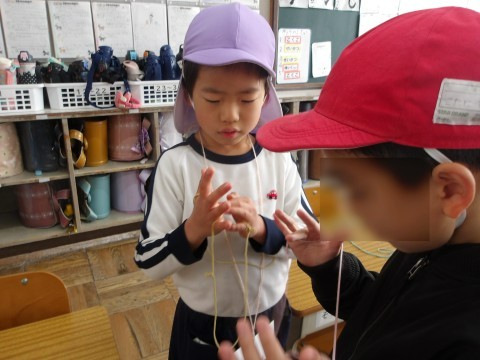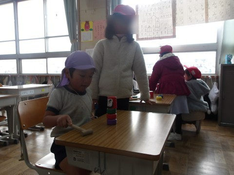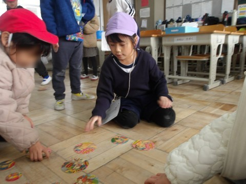 小学校との交流がありました。昔遊びを一緒に楽しみました。はじめは緊張気味でしたが,小学生のお兄さんお姉さんたちに名前を呼んでもらって一緒に遊んでいるうちに笑顔が見られるようになってきました。優しく丁寧に遊び方を教えてもらって嬉しそうでしたよ。