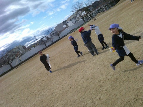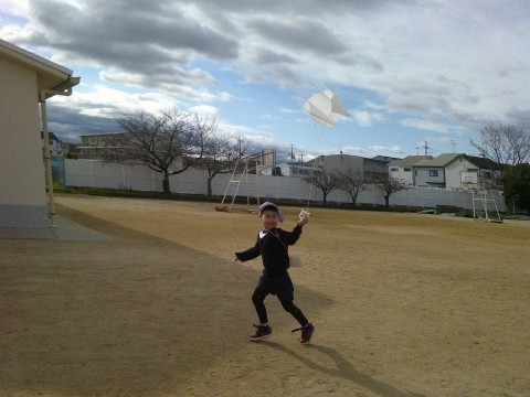 幼稚園子どもに凧あげをさせてもらいました。お兄さんお姉さんと一緒に広い運動場をめいっぱい走りました。風もありよく上がって楽しそうでした。