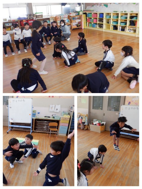 絵を描いた後は、今日も自分がなりたいものに変身して遊びました。今日はカエルたちを食べようとするヘラクレスオオカブトが出てきてさぁ大変!誰か助けてくれるのか?はたまたもっと恐ろしいものがでてくるのか?子ども達のイメージを大切にしながら進めていきたいと思います。