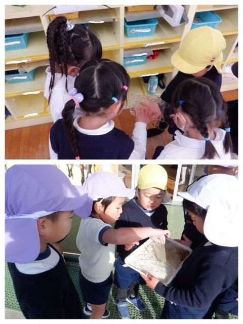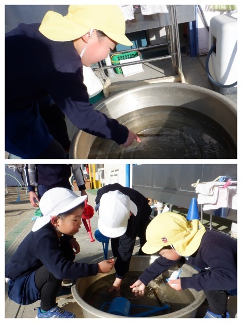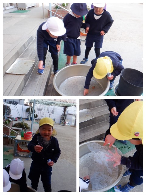 かけ足の前に、自分の植木鉢に水やりをしようとタライに行くと大発見☆たらいの水が凍っています。「うわぁ!氷や~氷あるで~!」と近くの友達に知らせて大喜び♪「他にもあるかなぁ?」と園庭の色々な所を探しに行っていました。たくさん集めて、まだ身支度中のお友達にも見せてあげていましたよ。今だけのお楽しみ!かけ足前に楽しんでいました。