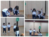 お話ごっこでは、ウサギさんが大切に育てていた野菜をカラスさんが持って行っちゃった・・・。「カラスさんを怒らないとだめだよ」「返してってお願いする?」「返さないよ。食べちゃうねん」「でも、最後はみんななかよしになりたいな」「どうしたらいいかな?」などと、ごっこ遊びをする中で3歳児なりにそれぞれの思いや考えを出しながら、先生や友達とおはなしをつくることを楽しんでいます。遊戯室におうちの人たちの観覧席があることに気付き、「早く見てほしいな♪」とみてもらうことを楽しみにする姿もあります。明日は、どんなお話になるかな?