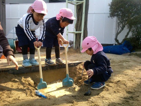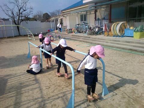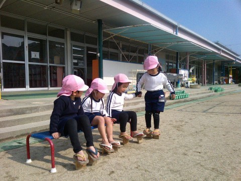 おはなしごっこをした後は、戸外でたっぷり遊びました。一本下駄に初めてチャレンジする姿も・・・。ちょっと難しいことにもチャレンジしたくなってきたもも組さんがいっぱいです。砂場では工事ごっこをして楽しんでいましたよ。寒さも少し和らぎ、戸外での遊びを存分に楽しみました。