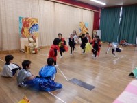 たんぽぽ組さんの劇遊びを見にいきました。とってもかわいくて,子ども達も一生懸命に見て魔女が素敵,オムライスを料理しているところが素敵,カエルのダンスが素敵などたくさん感じたことをたんぽぽ組さんに伝えていました。午後はすみれ組の劇を見てもらいました。保育室では劇遊びの絵を描きました。すきな場面を思い思いに描いていました。