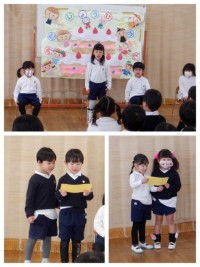 子ども達の豊かな言葉と心を育む為には、お家の人のおひざの上で温かなぬくもりを感じながらゆったりとした気持ちでお話を聞く時間が大切だと思っています。すみれ組の保護者のみなさま、おひざ絵本はこれでおしまいではなく小学校に行っても時にはひざの上で、また隣に座って一緒に本を見る機会をぜひつくってくださいね。年間を通してご協力ありがとうございました。