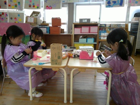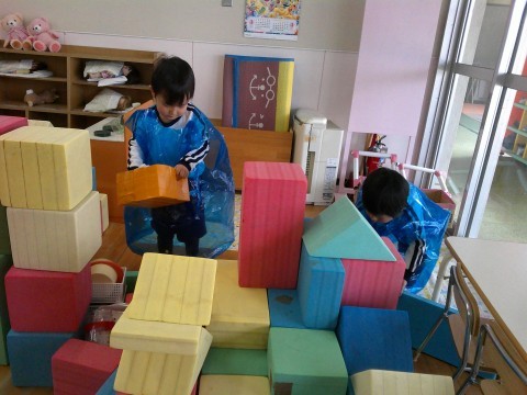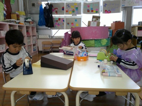 今日は、朝から天気がややこしかったので、子どもたちは保育室での遊びを楽しんでいました。昨日の続きを楽しむ子どもたち。空き箱などの素材やテープ類を使うって、イメージを広げながらつくることを楽しんでいましたよ。