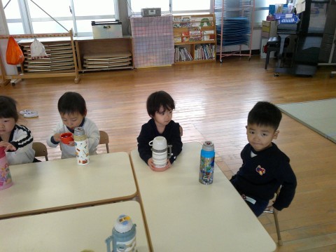 お片付けした後は,みんなでお茶を飲みました。コップの蓋をあけてお茶を注げると,「みて!できたよ!」と嬉しそうに見せてくれましたよ!