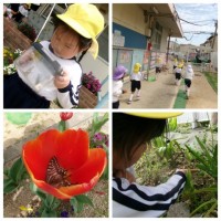 描いた後は園庭に一目散!!「虫捕りにいく~!」とアゲハを探しに行きましたが高い所をとんでいて捕まえられず、がっかりしていましたがアゲハの幼虫と卵を見つけて大喜び♪花壇ではダンゴムシを探したり、すみれ組さんにカブトムシの幼虫を見せてもらったりなど、今年度も虫との出会いがたくさんありそうですよ!