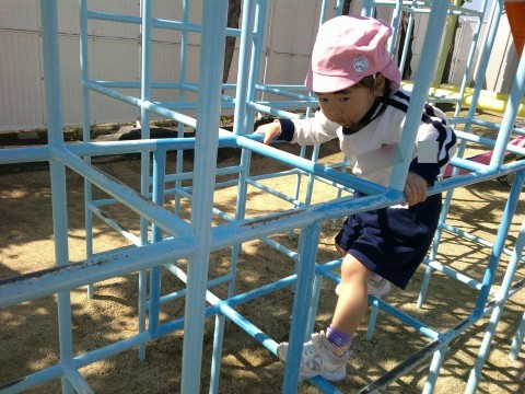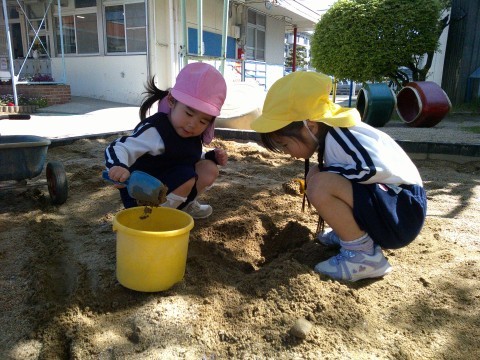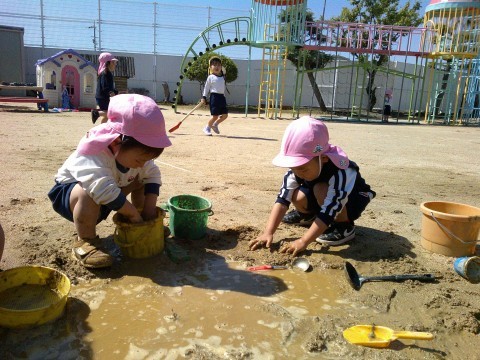 他にも,ジャングルジムや砂遊びなど好きな遊びを見つけて遊ぶ姿がありました。昨日の雨でできた水たまりでどろんこをしている子どもたちも。「気持ちいい!」と手で実際に触れて感触を楽しんだり,「ご飯作ってるねん!」と器に泥をためることを楽しんだりしていました😊服もどろんこになるぐらい楽しんでいました♪