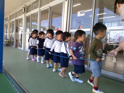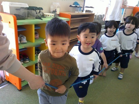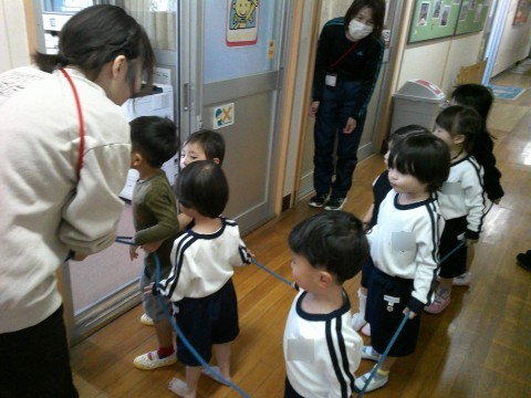 お片付けをした後には,電車に乗って幼稚園の中の探検にしゅっぱ~つ!「がたんごとん。」と電車に乗りながら,すみれ組さんやたんぽぽ組さんのお部屋や先生のお部屋など,どんなお部屋があるのかをみんなで見に行きました。絵本のお部屋では,「この絵本読んでみたい!」と絵本を選んでみる姿もありましたよ!