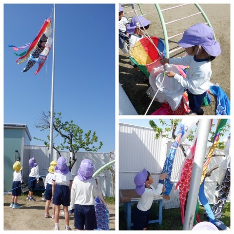 自発活動の時間に「こいのぼり上げるの手伝って~」と声をかけると、すぐにすみれ組さんが来てくれました。「僕はお父さんのこいのぼりをつけたい!」「これは吹き流しやな!」「どの順番につける?」と昨年度までのことを思い出しながらこいのぼりをロープにつけて、空高くまであげてくれました。「めっちゃ泳いでるなぁ」と子ども達も嬉しそうです。