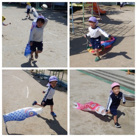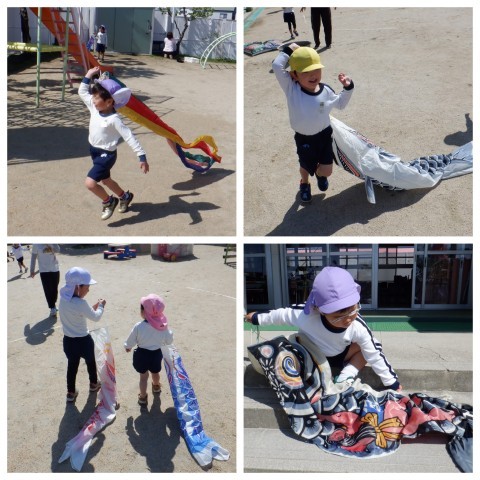 その後、園庭ではこいのぼりをもって「泳いでる?」と走り回って楽しんでいました。大きさを比べたり、模様をじっくり見たりして楽しむ子ども達もいましたよ。みんなも自分のこいのぼりをつくるのが楽しみだね。