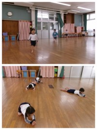 今日も大好きなダンゴムシごっこをしました。落ち葉(新聞紙)をムシャムシャ食べたり、布団にして寝たり、かくれんぼして遊んだり、いろいろな遊びが広がっていきました。絵本に出てきたカマキリ・モグラなど、ダンゴムシを狙っている生き物とのやり取りも楽しかったようで、夢中になって上手に丸まっていましたよ。振り返り活動では、「全部楽しかった♪」という声もありました。最後に残っている落ち葉(新聞紙)を丸めてダンゴムシを作りました。「黒くしたい!」「目をつけたい!」と、自分たちのもっているイメージ通りにしようと意欲的に作る姿がありました。赤ちゃんの白いダンゴムシや、大きなダンゴムシ、3匹家族のダンゴムシといろいろな個性豊かなダンゴムシが完成しました♪ダンゴムシのお庭にダンゴムシが大集合!ダンゴムシたちと一緒におにぎり弁当もいただきましたよ。