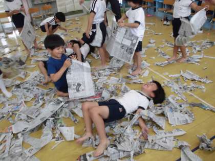 ジャンケンゲームを楽しんだ後は、ビリビリとダイナミックに破いて新聞の海にして遊びました。泳いだり、上に投げたりして「おめでとう〜」と新聞を掛け合って遊びました。
