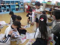 すみれ組さんとたんぽぽ組さんが登園後キュウリに水やりをしに来ていたので、大きくなったキュウリを一緒に見ながら、ふとザリガニ池に目をやると…。なんと睡蓮の花が咲いていました。白くてとっても綺麗です。カエルの葉っぱも増えていました。
