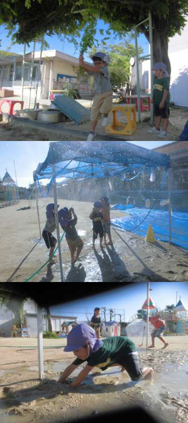 お昼は暑さでなかなか園庭では遊べませんが、夕方4時からは園庭でたっぷり遊びました。再び水遊びでびっしょりです☆