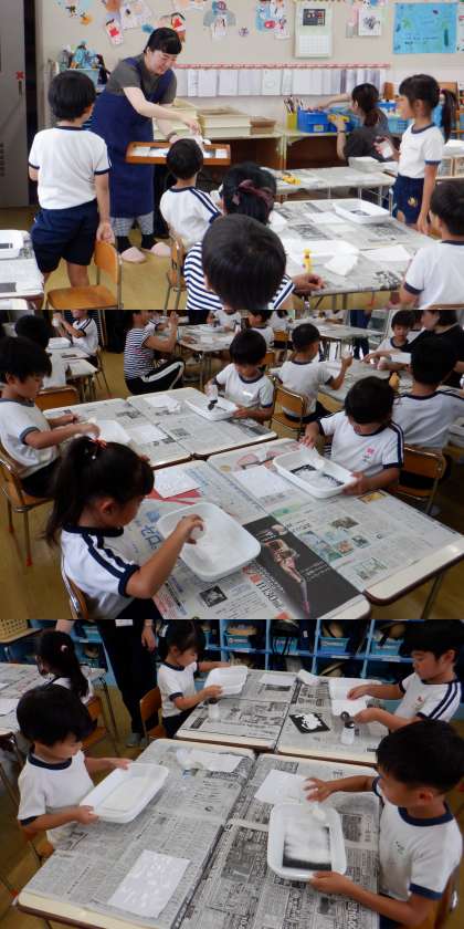 講師の先生の見本をみるとすぐにどんどんやってみたくなるのがすみれ組さん!ボンドで描く絵もすぐに描き始めました。ボンドの先を上手に使って細かい線まで描いている子もいましたよ。さすがだね。