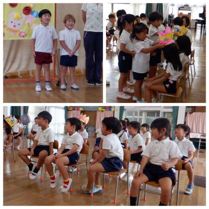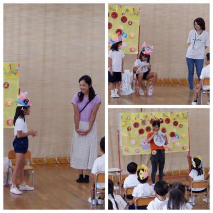 お誕生日のお友達は、自己紹介も年長さんからのインタビューにも上手に答えていましたよ。また、今月の誕生会では、お楽しみが2つもありました!今、すみれ組に来てくれている実習生のお楽しみと園長先生のお楽しみです。どんなお楽しみだったのかは、ぜひお家で聞いてくださいね。
