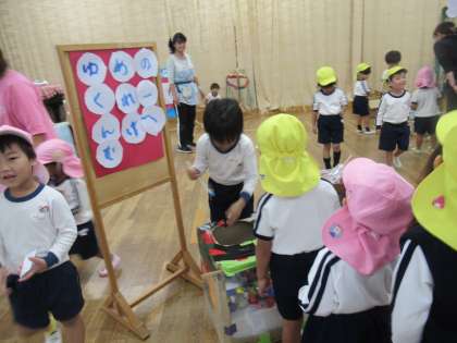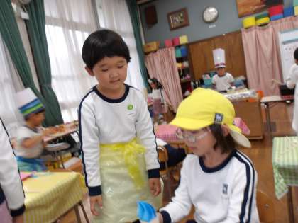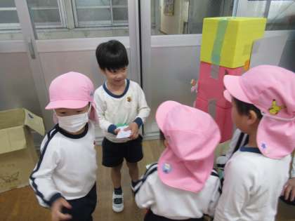 今日はみんな遊戯室の「みんなのゆめワールド」にたんぽぽ組さんと、もも組さんが遊びに来てくれました!入場の時にチケットを配って、子ども達のお店に入ってくれました。「いらっしゃいませ!」「バスケ、おもしろいですよ〜」と声をかけて呼び込みをしていましたよ。「楽しかった」「ごはん、おいしかった」「どんぐりコースター、転がせたよ」などなど感想をきかせてもらって、とってもうれしそうな子ども達でした。もともと役割を決めてたのですが、今日はお休みの子が多かったので、子供達は大忙し!でもとっても楽しかったようです。