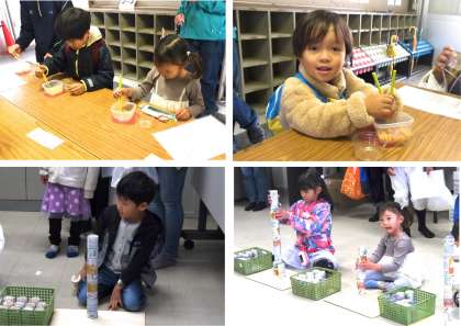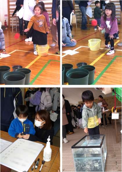 ・豆つかみ・玉入れ・空き缶つみ・コイン落とし・タイム計測の5種目があり、子どもたちはそれぞれ楽しんでいました。
