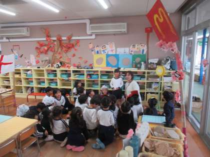 振り返り活動では、年長さんが言ってくれる感想に目をキラキラさせて聞き入っていたたんぽぽ組の子どもたちです♪