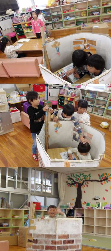 ダンボールハウスに入ることが子どもたちにとっては秘密基地のようでもあり、好きな遊びの場になっているようです。年少さんも「勉強するねん♪」といって塗り絵をしていました。上からのぞく年長さんたちは「えらいね〜!」と頭をなでなで☆