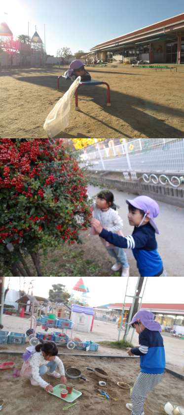 美味しくおやつを食べたあとは、園庭で中あてをしたり、砂場でお料理をつくったりして遊びました。「トンボが来るの、ここで待ってるねん・・・」寒くなってきてトンボもいつのまにか見なくなりましたね。