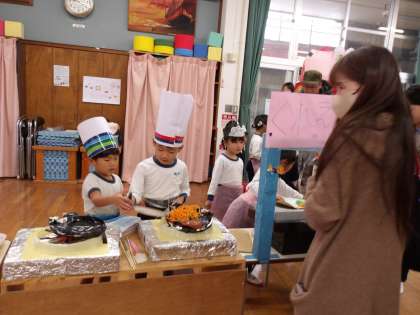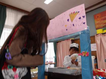 お客さんもたくさん来てくださって大繁盛!!子供達は大忙しで「注文は何にしますか?」「コックさん、パフェもおねがいします」「スペシャルメニューのハンバーグできあがり!」子供達のレストランは大忙しの様子でした☆