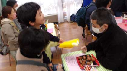 今日はまちにまった「つくってあそぼう」。子供達は始まる前から、「おうちの人が来てくれる!」とワクワクしている様子。「3 2 1 オープン!」の掛け声で「みんなのゆめワールド」が開店しました。
