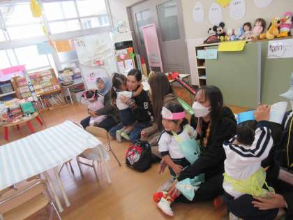 15日 つくってあそぼう保育参加4 公開日 2023/11/15 更新日 2023/11/15 3歳児 振り返りをしました。 「お客さんが、いっぱいきてくれて嬉しかったよ」 「お店屋さんするの楽しい!」と、お話してくれました。 おうちの人からは「どのお店もおいしかったし、ゲームも楽しかったよ!」 「お客さんがいっぱいきたのにお店のお仕事頑張っていたね!」と、ほめてもらいました。 ハグもしてもらって嬉しそうでしたね。 最後にみんなでパーティーをしました。