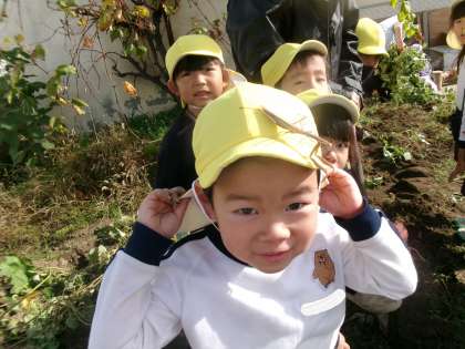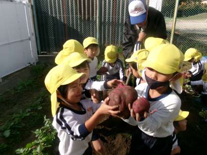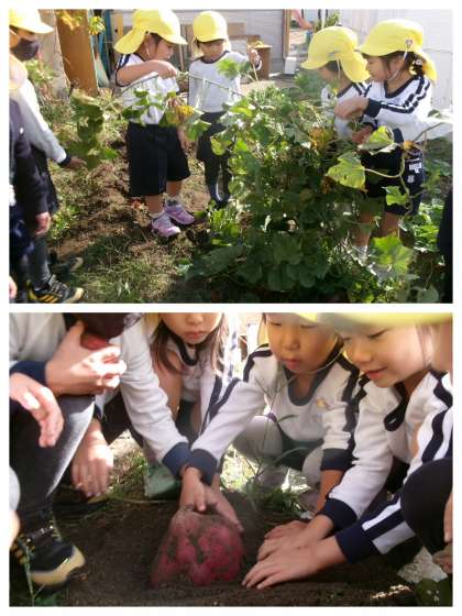 お友だちのお顔より大きなお芋です♪「おもたいな!」と両手で大事そうに運んでいましたよ!かきにサツマイモと秋の収穫を楽しんでいる子どもたちです!