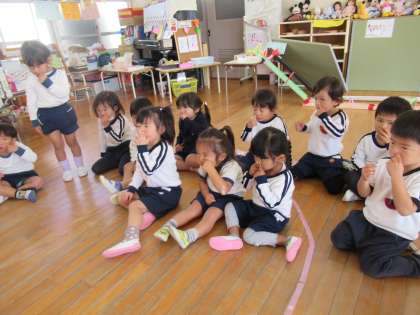 気温も低くなり、鼻風邪をひいている子どもたちも増えてきました。鼻が出たままになっている子どもたちもいるので、今日は鼻のかみ方の指導を行いました。紙芝居「はなみずちゅるる〜ん!」を読み、「ハナミズマン」がバイキンを体の外へ追い出してくれることを話しました。