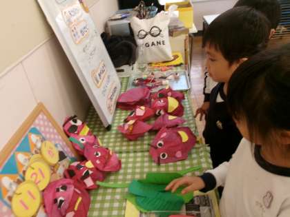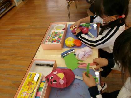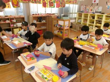 コーヒーフィルターをサツマイモ色に染めて中にはふかふかのお花紙をいれました★