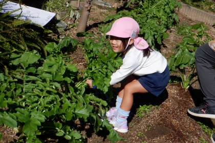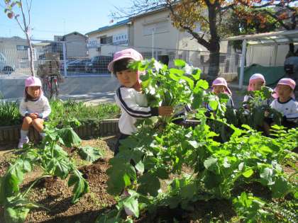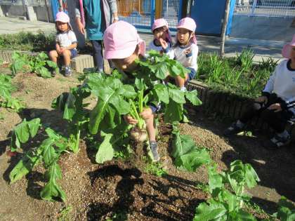 子どもたちが育てている浪花の伝統野菜、田辺大根と天王寺蕪の収穫をしました。