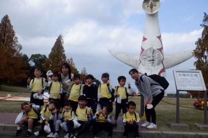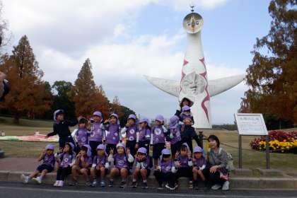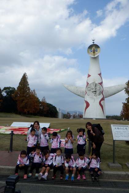 ニフレルに行った後は、万博公園に行きました。太陽の塔の迫力にビックリ!「あの顔は、ニワトリ?」「ちょっと怖いなあ」「大きい!!」「おもしろい顔やな」と子供達は口々に感想を言っていましたよ。太陽の塔の前で記念撮影。パチリ!