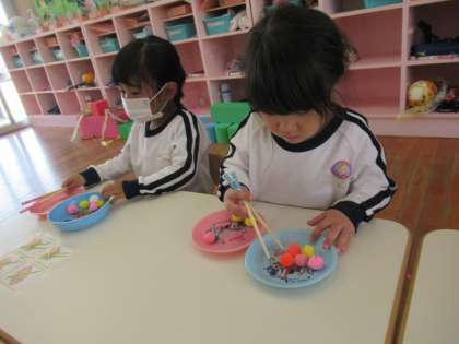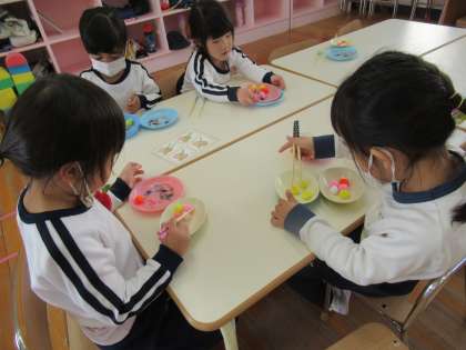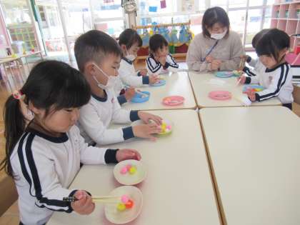 11日 今日の様子1 もも組(3歳児) 公開日 2024/03/12 更新日 2024/03/12 3歳児 お箸で遊びました。 ぼん天をお箸でつまんで隣のお皿に移し替える遊びをしました。 「ちょっと難しいなー」といいながらも 「できたよ」と嬉しそうに遊んでいましたよ。 「もう1回する!」と何度も繰り返し遊んでいました。 遊びながらお箸の使い方が上手になりますよ。 おうちでも遊んでくださいね。